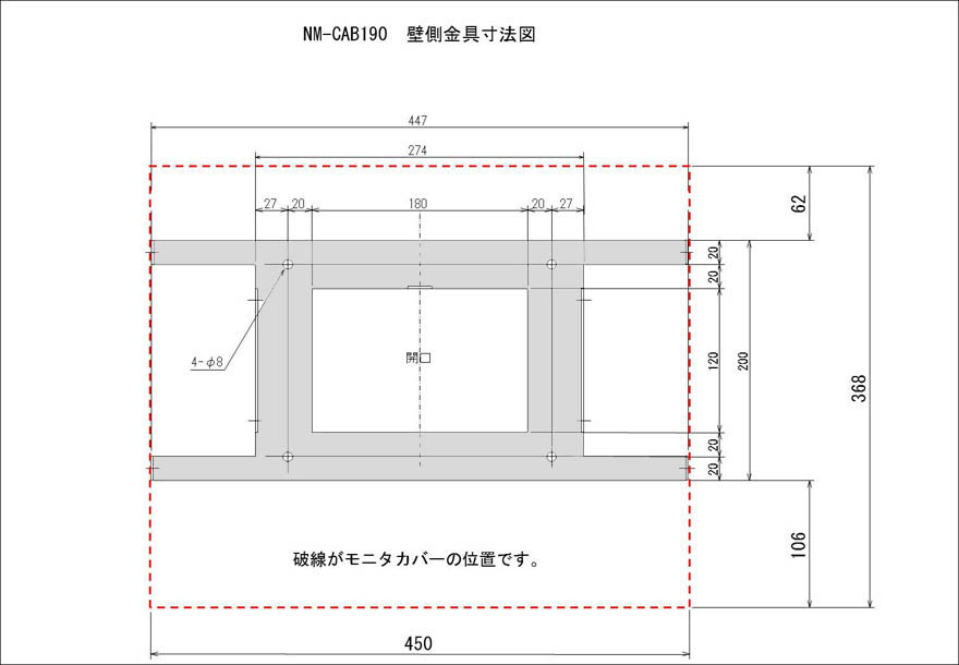 壁側金具にモニタカバーを取り付けた時の位置を表示します。